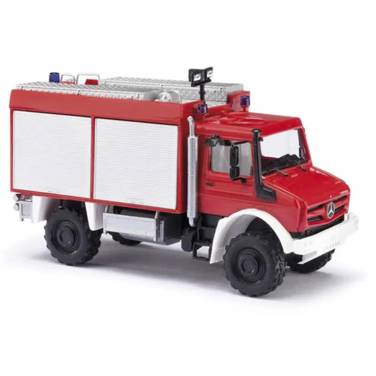 This is a Busch 51052 HO Scale 2014 Mercedes-Benz Unimog U 5023 Fire Truck – Fire Department (red, white, silver, German Lettering).