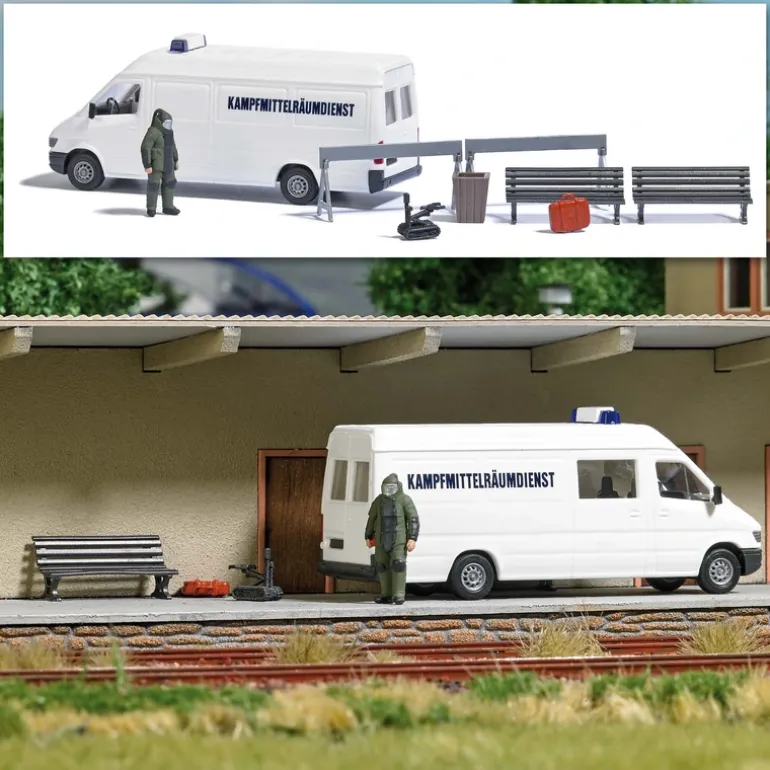 This is a Busch 7953 HO Unattended Baggage Figure Set. Does the unattended suitcase on the train platform contain explosives A robot from the bomb disposal team investigates the suspicious object in detail. With technician in protective suit, robot, suitcase, waste bin, 2 benches and barriers as well as Mercedes-Benz Sprinter service vehicle.