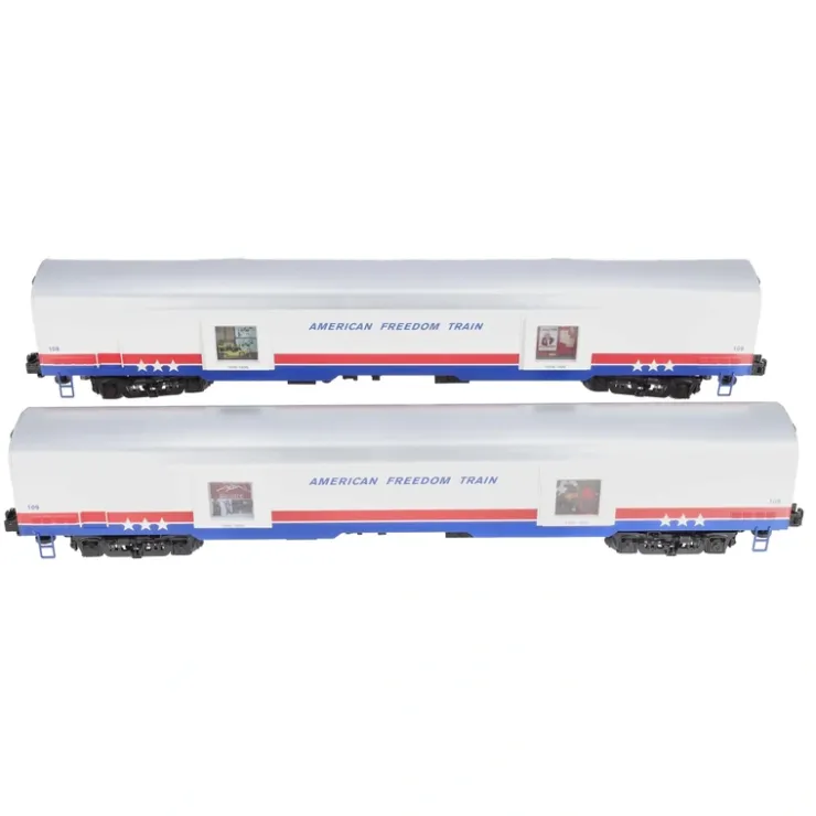 We’ve packed our Freedom Train cars with plenty of fun features. The power car features a generator sound which can be turned on when your train is on display. Exhibit cars feature backlit shadowbox panels in the converted baggage car doors. For the ultimate experience, the sound-equipped crew car features the rhythm of the rails as it rolls long and plays welcome messages for your patrons, patriotic music and sound clips to ensure this train is the main attraction on your layout even when stopped for display down by the station.