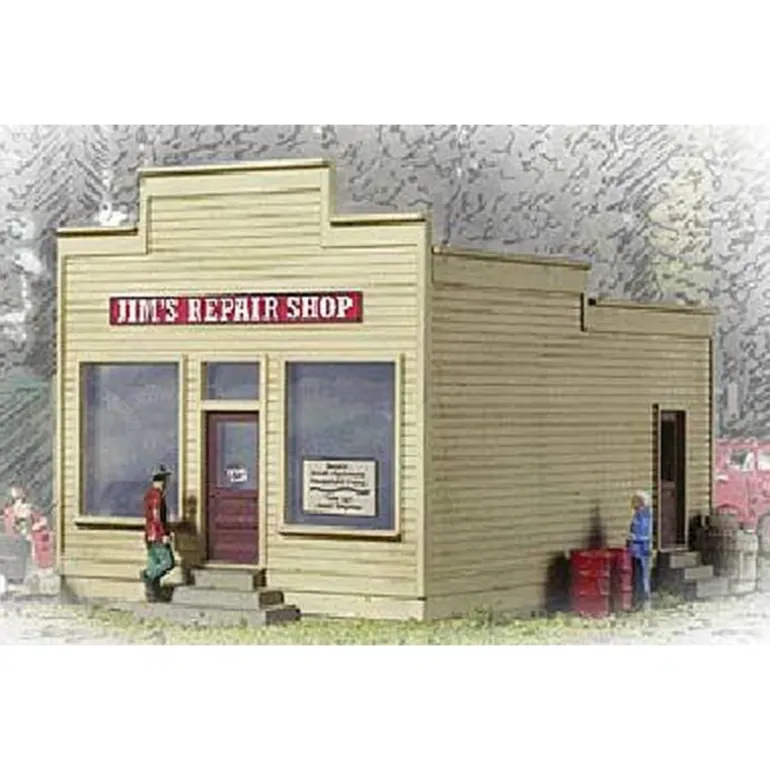 On your layout, the Walthers Cornerstone N Scale Jim’s Repair Shop is one of those buildings that fits everywhere. From damaged wheelbarrows to broken sewing machines, Jim can get anything working again. People in town know his real specialty – repairing things other people tried to fix but couldn’t! On Main Street, this small business makes a great small storefront. Elsewhere, its equally at home as a factory or mill office, a lakeside bait shop or restaurant, or a small roadside store. This easy-to-build kit has parts molded in appropriate colors and includes realistic decals. Jim’s Repair Shop measures: 2-3/4 x 1-3/4 x 1-3/4 6.8 x 4.3 x 4.3cm