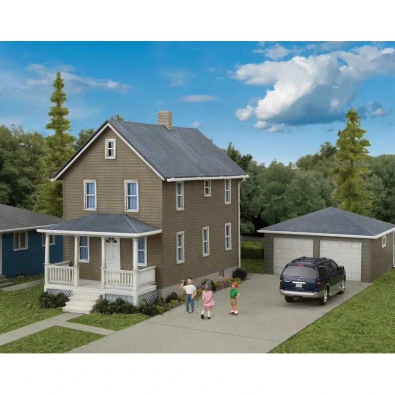 This is a Walthers 933-3792 HO Two Story House with Garage Kit. Detail any older neighborhood with this all-American structure kit from Walthers Cornerstone! Typical of homes that were updated in the 1950s and still lived in today, the kit features: Classic design for city or country living from the 1950s to the present Easily customized – includes two different front walls & porches Front porch plus separate doors, windows and other details Separate 2-car garage included – build with single or double doors Molded in four colors with clear acetate windows House: 5 x 2-1/2 x 4-1/16 12.7 x 6.3 x 10.3cm Garage: 3-1/8 x 3-1/8 x 2 7.9 x 7.9 x 5cm over eaves