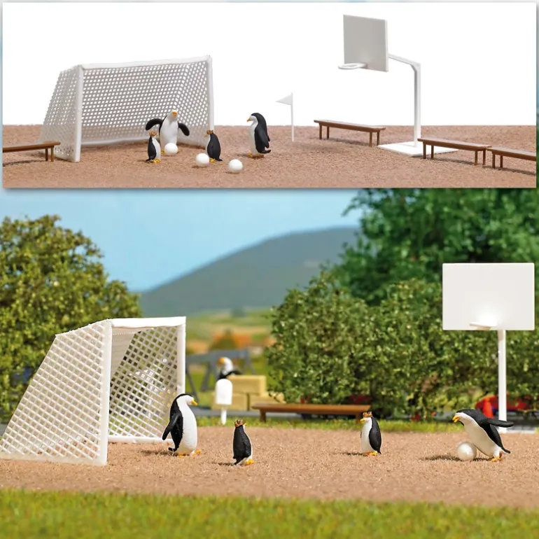 This is a Busch 7926 HO Scale Penguin Ball Game Action Set. Action set to bring your model world to life realistically: 4 penguins in different sizes playing ball. With balls, goal, corner flags, basketball hoop, rubbish basket, benches and playing field (210 x 148 mm).