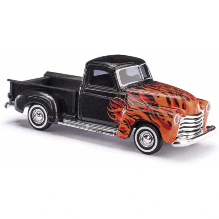This is a Busch 48287 HO Scale 1950 Chevrolet Pickup Truck – Black with Red & Orange Flames. This layout-ready vehicle features a finely detailed plastic body, interior, clear window glazing, authentic paint and printed graphics and realistic chrome-finished parts where appropriate.