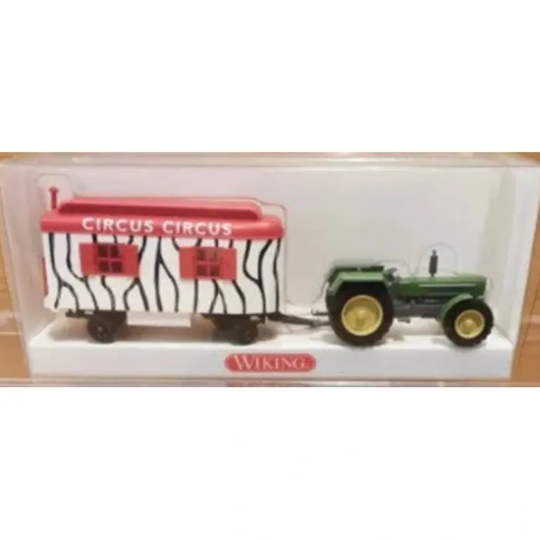 This is a Wiking 08754034 HO John Deere Tractor W/Circus Trailer Attached.