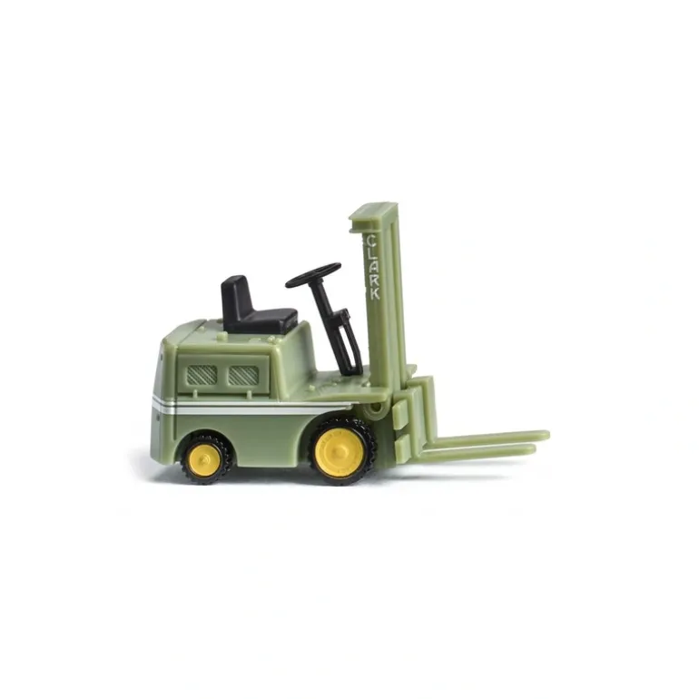 This is a Wiking 117101 HO Scale Clark Pale Green Forklift Truck. Body and chassis as well as forklift mast and fork pale green. Steering wheel, seat and tires black. White ornamental strips all around as well as white Clark lettering on the rear. White Clark lettering on the side of the forklift mast. Wheels in contrasting yellow.