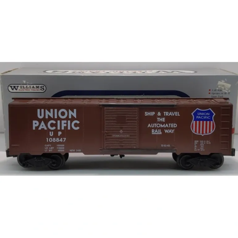 Here is a Williams 108847 O Gauge Union Pacific Boxcar. Features include die-cast trucks, operating knuckle couplers, and metal wheels. It is Lionel compatible.