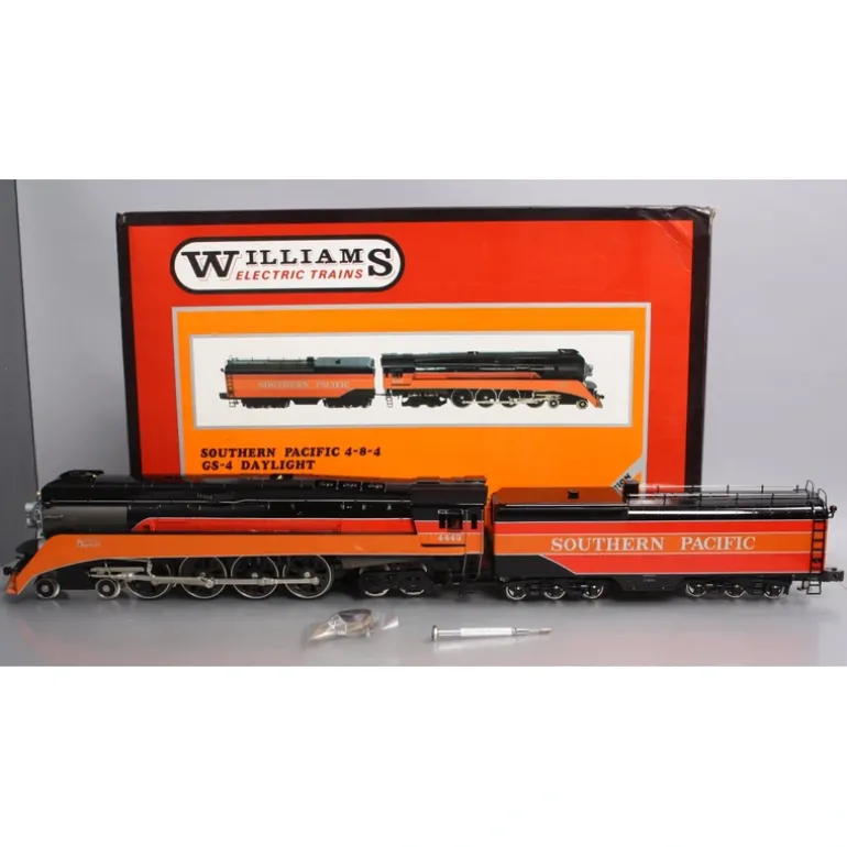 Here is a Williams 5600 O Gauge BRASS Southern Pacific Daylight 4-8-4 GS-4 Steam Locomotive & Tender #4449. Features include all-brass construction, operating smoke unit, flywheel coasting drive train, electronic reverse unit with lock-out switch, operating knuckle coupler, sprung loaded drivers, operating marker lights, constant voltage head light, operating back up light. It operates on O72 curves or bigger. It is Lionel compatible.